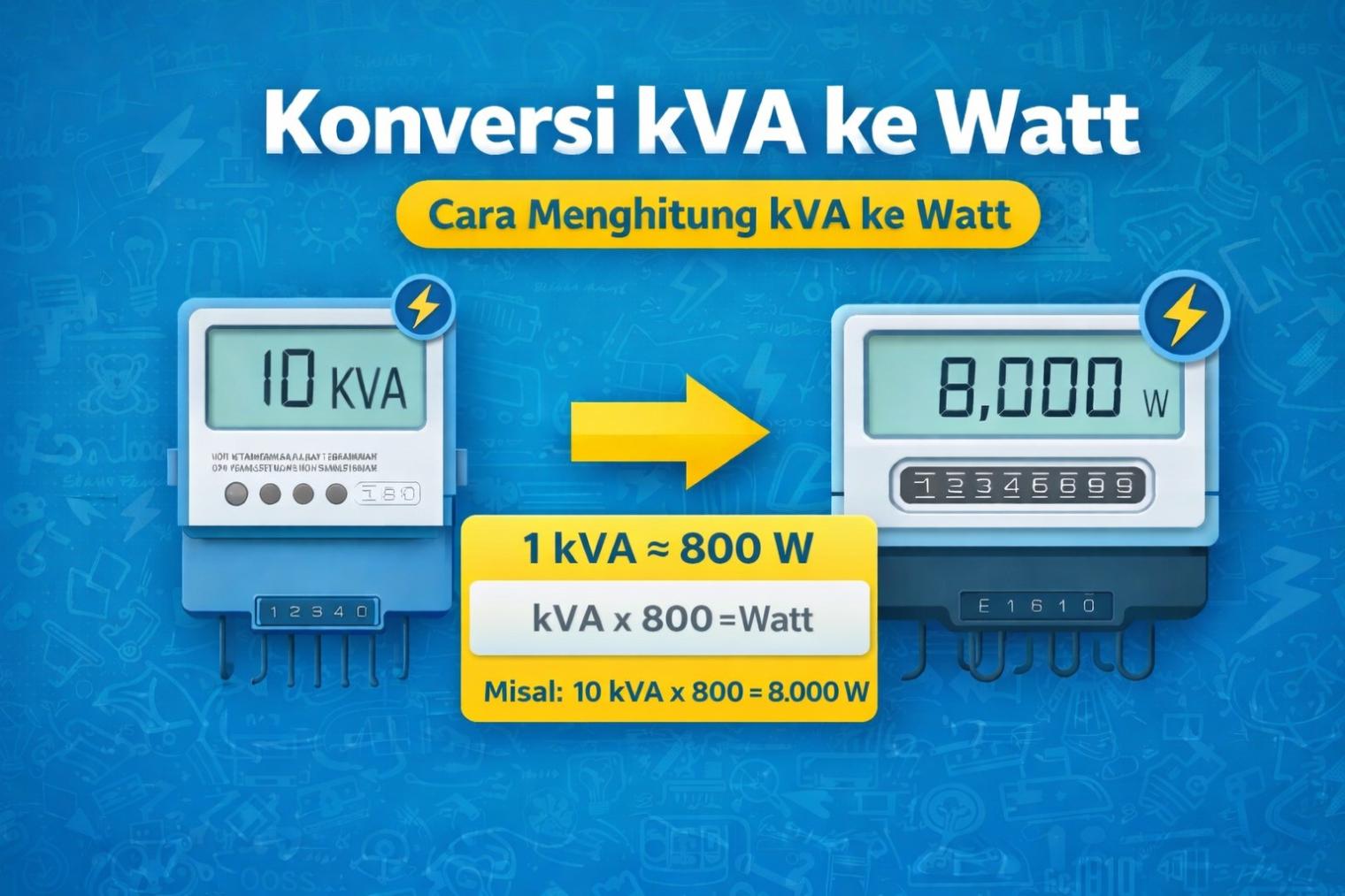 Untuk dapat menghitung satuan kVA ke Watt, Anda perlu mengetahui terlebih dahulu apa itu kVA dan kW. Dalam sistem kelistrikan, kVA atau kiloVolt-Ampere adalah satuan yang digunakan untuk mengukur daya semu dalam rangkaian listrik. Pada sirkuit DC, jumlah kVA sama seperti kW, yaitu daya semu (kVA) sama dengan daya nyata (kW). Tetapi formula ini tidak berlaku untuk sirkuit AC, karena perhitungan kVA ke kW dipengaruhi oleh Power Factor.